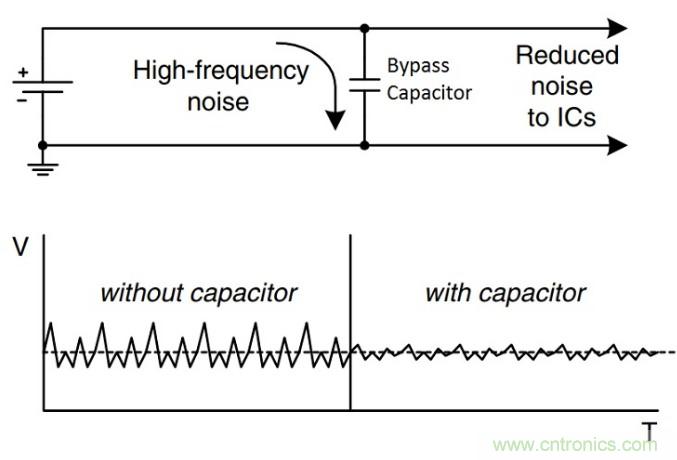 旁路電容器可以用作臨時(shí)電流源,有助于減少波動(dòng)。