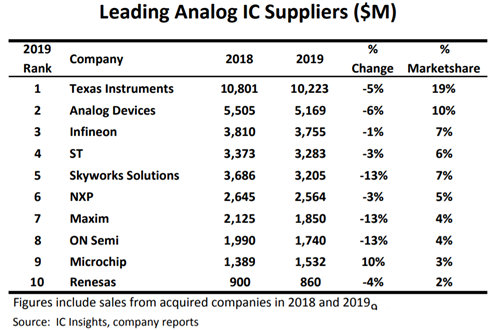 TI德州儀器是第一個制造出集成電路的公司,在電源管理和運算放大器這兩個領(lǐng)域處于龍頭地位,下游市場集中于工業(yè)和汽車電子市場。TI2019年的模擬收入占其IC總銷售額128億美元的80%,占其半導(dǎo)體總收入137億美元的75%。