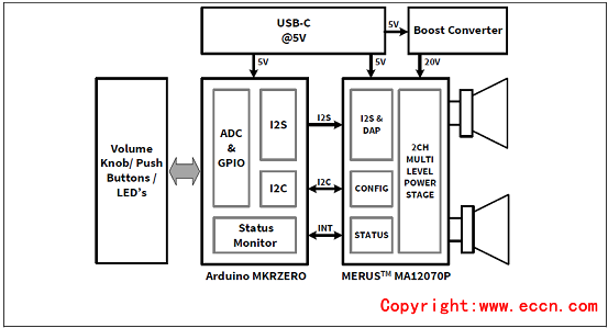 The KIT_ARDMKR_AMP_40W board is an audio amplifier board compatible with the MKRZERO board from Arduino and built around Infineons MERUS™ MA12070P multilevel amplifier. In Figure 2 the following main system components are identified: