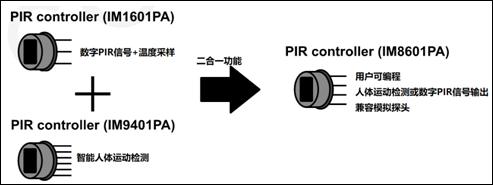 圖1 M8601 可編程數(shù)PIR信號(hào)調(diào)理芯片, 結(jié)合了數(shù)字PIR芯片和智能人體運(yùn)動(dòng)檢測(cè)功能
