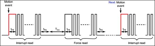 除上述特點(diǎn)以外,M8601還具備獨(dú)特的防誤報(bào)功能。當(dāng)M8601配置在人體運(yùn)動(dòng)檢測(cè)工作模式條件下,一旦芯片檢測(cè)到人體移動(dòng)信號(hào)并且通過INT/DOCI接口發(fā)出Motion中斷,外部單片機(jī)識(shí)別到中斷信號(hào)之后無需重新配置,可以通過INT/DOCI接口立刻進(jìn)行數(shù)據(jù)采集得到原始PIR信號(hào)。然后,單片機(jī)再按照預(yù)先設(shè)定的算法,對(duì)INT/DOCI接口采集到的PIR原始數(shù)據(jù)以及之前收到的Motion中斷信號(hào)進(jìn)行邏輯運(yùn)算,可以進(jìn)一步判斷是否為真實(shí)的人體運(yùn)動(dòng)信號(hào)還是誤報(bào)。芯片的這一功能在很多需要防誤報(bào)的應(yīng)用場(chǎng)景中非常重要,如監(jiān)控?cái)z像機(jī)、高端遠(yuǎn)程監(jiān)控報(bào)警器、紅外攝像機(jī)等等。詳細(xì)工作的時(shí)序圖如下圖2。