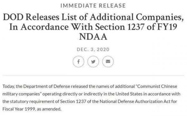 12月4日早間消息,當(dāng)?shù)貢r間周四,美國國防部官網(wǎng)宣布根據(jù)經(jīng)修訂的《 1999財政年度國防授權(quán)法》第1237條的法定要求,正式將中芯國際(SMIC)、中國建設(shè)科技集團(CCTC)、中國國際工程咨詢公司(CIECC)、中海油(CNOOC)四家中國企業(yè)加入“軍事最終用戶”(Military End-User),此舉將使得美國企業(yè)在向這四家企業(yè)供應(yīng)相關(guān)技術(shù)或產(chǎn)品時,需要獲得美國的許可。