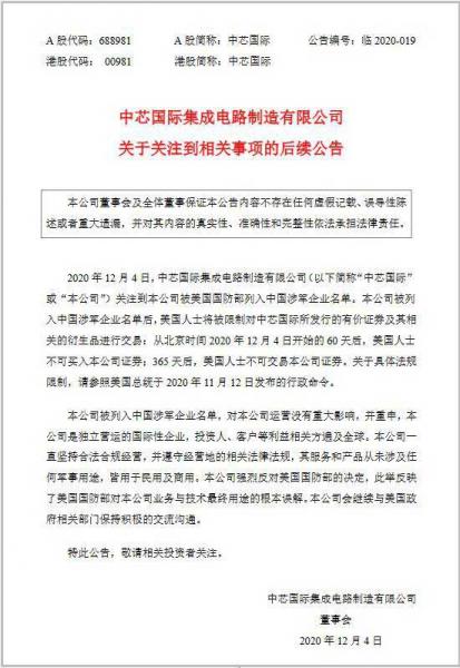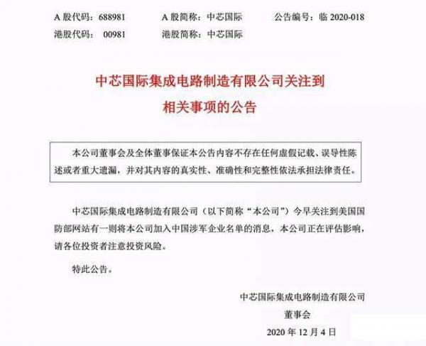 對此消息,中芯國際在12月4日開盤前發(fā)布公告回應(yīng)稱,“中芯國際今早關(guān)注到美國國防部網(wǎng)站有一則將本公司加入中國涉軍企業(yè)名單的消息,本公司正在評估影響, 請各位投資者注意投資風(fēng)險!