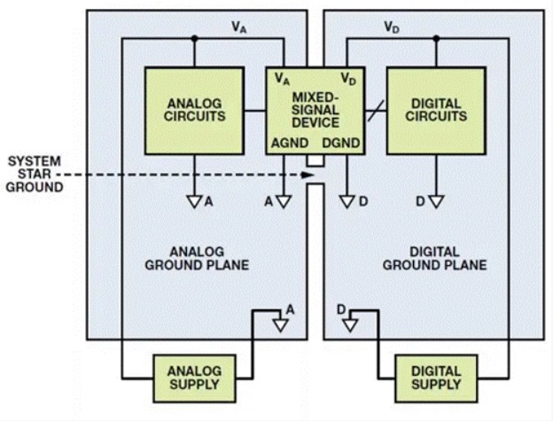 這樣就基本在混合信號器件上產(chǎn)生了系統(tǒng)“星型”接地。所有高噪聲數(shù)字電流通過數(shù)字電源流入數(shù)字接地層,再返回數(shù)字電源;與電路板敏感的模擬部分隔離開。系統(tǒng)星型接地結(jié)構(gòu)出現(xiàn)在混合信號器件中模擬和數(shù)字接地層連接在一起的位置。