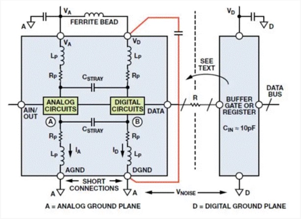 不過,為了防止進(jìn)一步耦合,AGND 和 DGND 應(yīng)通過最短的引線在外部連在一起,并接到模擬接地層。DGND 連接內(nèi)的任何額外阻抗將在 B 點(diǎn)產(chǎn)生更多數(shù)字噪聲;繼而使更多數(shù)字噪聲通過雜散電容耦合至模擬電路。請注意,將 DGND 連接到數(shù)字接地層會在 AGND 和 DGND 引腳兩端施加 VNOISE,帶來嚴(yán)重問題!