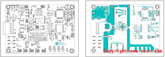 圖14.評估板MAX17320G EVK PCB設(shè)計(jì)圖(1):左:頂層絲印;右:頂層