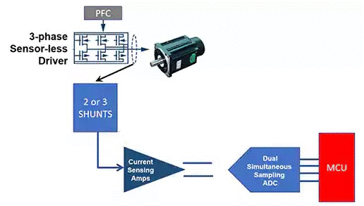 圖 1:電機(jī)控制系統(tǒng)包括用于穩(wěn)定電源的 PFC、用于 BLDC 電機(jī)繞組的三相無傳感器驅(qū)動器、分流電阻和電流檢測放大器、同步放大器 ADC 以及微控制器。