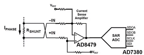 圖 2:電機(jī)相位感測系統(tǒng)使用電流分流電阻器 (RSHUNT),配合高精度放大器(例如 Analog Devices 的 AD8479)和高分辨率 ADC (AD7380) 測量瞬時(shí)電機(jī)相位。