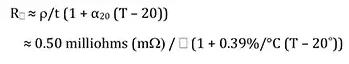 利用上述變量,通過(公式 1)計(jì)算在室溫下 PC 板 1 盎司銅的印制線電阻 R: