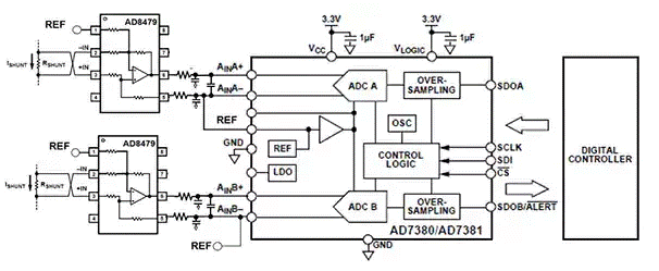 此電機(jī)控制系統(tǒng)適用的 ADC 是 AD7380 雙通道同步采樣 SAR-ADC(圖 4)。