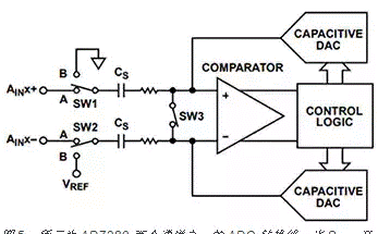 圖 5:所示為 AD7380 兩個(gè)通道之一的 ADC 轉(zhuǎn)換級。當(dāng) SW3 開路并且 SW1 和 SW2 閉合時(shí),信號采集開始。此時(shí),CS 兩端的電壓隨著 AINx+ 和 AINx- 的變化而變化,導(dǎo)致比較器輸入失去平衡。