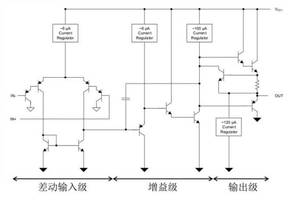雖然各家廠(chǎng)商推出的運(yùn)算放大器性能與規(guī)格互有差異,但是一般而言標(biāo)準(zhǔn)的運(yùn)算放大器都包含下列三個(gè)部分。