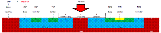 如圖4所標(biāo)注,PNP管的發(fā)射極,P基底和NPN管的集電極構(gòu)成了一個(gè)寄生的NPN管,當(dāng)運(yùn)放的輸入低于-0.3V時(shí)(比如-1V),寄生的NPN管的發(fā)射極比基極低-1V,這個(gè)電壓足夠使得寄生的NPN管導(dǎo)通,從而引起電流從集電極流向基極,這樣,原本原本隔離開(kāi)的兩個(gè)晶體管之間就有了電氣連接,同時(shí)與GND之間也有了電氣連接,芯片將無(wú)法正常工作。
