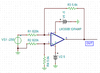 圖6是一個(gè)常見(jiàn)的電壓測(cè)量電路,LM358B由±5V供電,很容易可以推算出正常工作時(shí)Vout=VS1*(-R3/R1)=-250V*(-5.6/820)=1.71V。