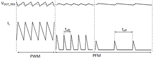 · 采用TI專利的SOO(平滑開(kāi)通/關(guān)斷時(shí)間控制)技術(shù),支持輕載時(shí)PWM模式到PFM模式的無(wú)縫過(guò)渡,實(shí)現(xiàn)全負(fù)載下無(wú)電壓漂移,滿足嚴(yán)苛的輸出電壓精度要求,并能通過(guò)延長(zhǎng)關(guān)斷時(shí)間toff來(lái)大幅提升輕載效率,如圖3所示。