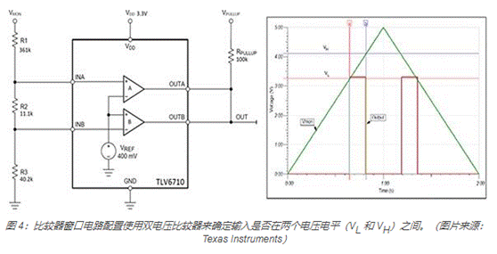 單電壓比較器可以檢測(cè)輸入電壓是高于還是低于參考閾值。確定輸入電壓是否在兩個(gè)極限之間時(shí)(稱為開(kāi)窗),需要使用兩個(gè)比較器,每個(gè)極限值使用一個(gè)比較器(圖 4)。