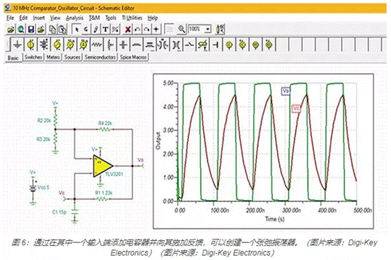 通過(guò)使用正負(fù)反饋,可以將比較器配置為弛張振蕩器(圖 6)。