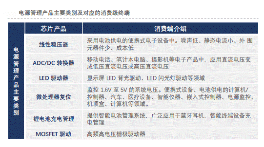 b.電源管理類模擬芯片產(chǎn)品:LED驅(qū)動(dòng)電路以及線性穩(wěn)壓器、ADC/DAC轉(zhuǎn)換器、CPU電源監(jiān)測電路、鋰電池充電管理芯片、過壓保護(hù)電路及負(fù)載開關(guān)等非驅(qū)動(dòng)類電源管理產(chǎn)品。