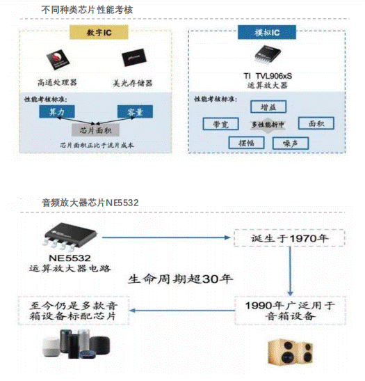 3.生命期:模擬IC產(chǎn)品生命周期一般不低于10年,一旦切入產(chǎn)品便可以獲得穩(wěn)定的芯片出貨量。先進(jìn)制程對(duì)于模擬類產(chǎn)品推動(dòng)作用較小,基本不受摩爾定律推動(dòng),因此模擬類產(chǎn)品性能更新迭代較慢。著名的音頻放大器芯片NE5532生命周期長達(dá)30年,至今依然是多款音響設(shè)備的標(biāo)配芯片。