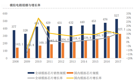 1.市場規(guī)模:模擬芯片全球規(guī)模達(dá)到527億美元,國內(nèi)規(guī)模達(dá)到327億美元,占據(jù)全球份額的62%。國內(nèi)增長速度高于國際市場。