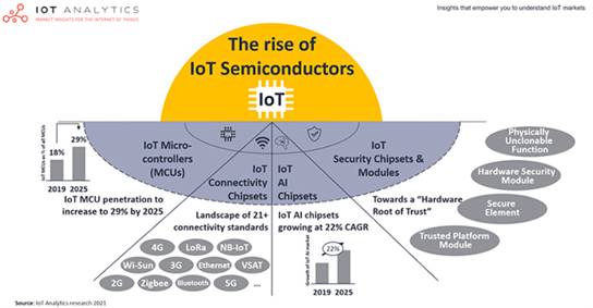 當(dāng)前的物聯(lián)網(wǎng)設(shè)備爆炸式增長(zhǎng)將繼續(xù)推動(dòng)物聯(lián)網(wǎng)半導(dǎo)體市場(chǎng),并可能在產(chǎn)量提高的情況下進(jìn)一步推動(dòng)半導(dǎo)體創(chuàng)新。IoT Analytics關(guān)于此主題的最新報(bào)告預(yù)測(cè),IoT半導(dǎo)體組件市場(chǎng)將從2020年的330億美元增長(zhǎng)到2025年的800億美元,達(dá)到19%的復(fù)合年增長(zhǎng)率。特別是,以下四個(gè)組件將成為人們關(guān)注的焦點(diǎn):IoT微控制器(MCU),IoT連接芯片組,IoT AI芯片組以及IoT安全芯片組和模塊。