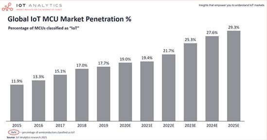 借助這些趨勢(shì),IoT Analytics預(yù)計(jì)IoT MCU在一般MCU市場(chǎng)中的滲透率將從2019年的18%增長(zhǎng)到2025年的29%。特別是32位MCU,例如,眾所周知的Raspberry Pi代表了IoT應(yīng)用的最佳選擇。