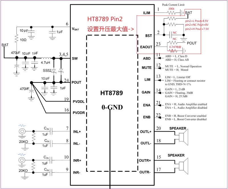HT878/HT878T(可任意限幅、單節(jié)鋰電池內(nèi)置自適應(yīng)升壓8W雙聲道音頻功放IC)