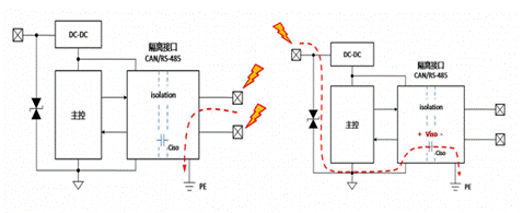 當(dāng)總線側(cè)接口受到靜電放電時(shí),靜電能量通過(guò)隔離接口模塊內(nèi)部總線側(cè)器件泄放至PE,但若ESD能量超出了接口模塊內(nèi)部總線側(cè)器件的ESD抗擾能力,總線接口則可能損壞,如下面左圖;