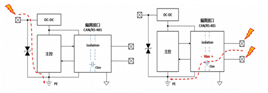 假設(shè)控制側(cè)均做了足夠的保護(hù)措施,當(dāng)控制側(cè)接口受到靜電放電時(shí),能量通過(guò)控制側(cè)保護(hù)器泄放至PE,對(duì)隔離通信接口基本無(wú)影響,如下面左圖;