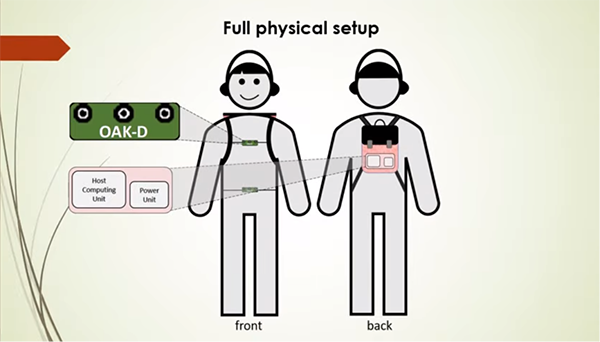 這個系統(tǒng)位于一個小巧的背包內(nèi),其中包含一個主機計算裝置,就像一個筆記本電腦。攝像頭隱藏在馬甲外套中,一個口袋大小的電池包放在腰包中,能夠提供使用大約8個小時的電力。一個Luxonis OAK-D空間人工智能攝像頭可以黏貼在馬甲或腰包上,然后連接到背包中的計算裝置。馬甲上有三個放置OAK-D攝像頭的小孔,而攝像頭則位于馬甲內(nèi)側。