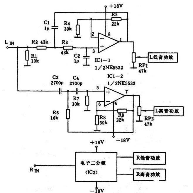 使用NE5532構(gòu)成的電子二分頻前級電路,可以把高音信號,用小功率功放放大,而低音用較大功率的功放放大,各司其職互不干擾。體積小成本低,分頻點準(zhǔn)確,分頻曲線理想,制作和調(diào)試容易。