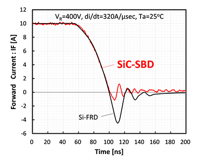 正向電壓VF(@ IF = 10A)低至1.5V,并且對(duì)開(kāi)關(guān)時(shí)功率損耗產(chǎn)生影響的恢復(fù)時(shí)間僅為10ns(@ VR = 400V),具有高性能二極管特性。這與硅快速恢復(fù)二極管相比,可以實(shí)現(xiàn)更快,更高效的工作。