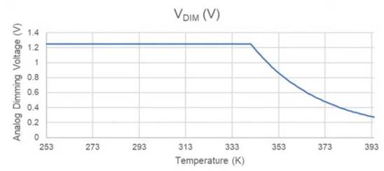 當器件處于70°C或更低溫度時,參考電壓提供的1.25V電壓會限制DIM輸入,并且LED會提供550 mA的電流。一旦溫度超過70°C閾值,電阻分壓器輸出就會降至1.25V以下。然后,DIM輸入遵循電阻分壓器配置文件,隨著溫度持續(xù)升高,這會減小LED驅(qū)動電流。