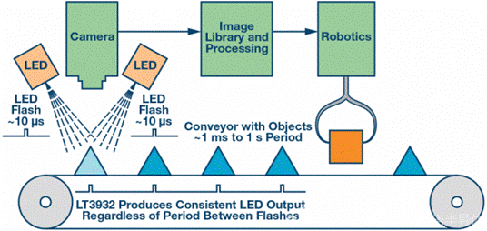 為了實現(xiàn)上述功能, ADI的高速LED驅動器LT3932可為高達2 A的LED串提供機器視覺相機閃光燈,關斷時間可以長達1秒、1小時、1天或更長時間,從而完美地解決這一問題。LT3932的特殊相機閃光燈功能允許其保持輸出電容和控制環(huán)路充電狀態(tài),哪怕是在長關斷時間內。對輸出和控制環(huán)路電容的狀態(tài)進行采樣后,LT3932繼續(xù)在長關斷期間對這些元件進行涓流充電,以補償通常都會有的漏電流,而這是其他LED驅動器沒有考慮到的。