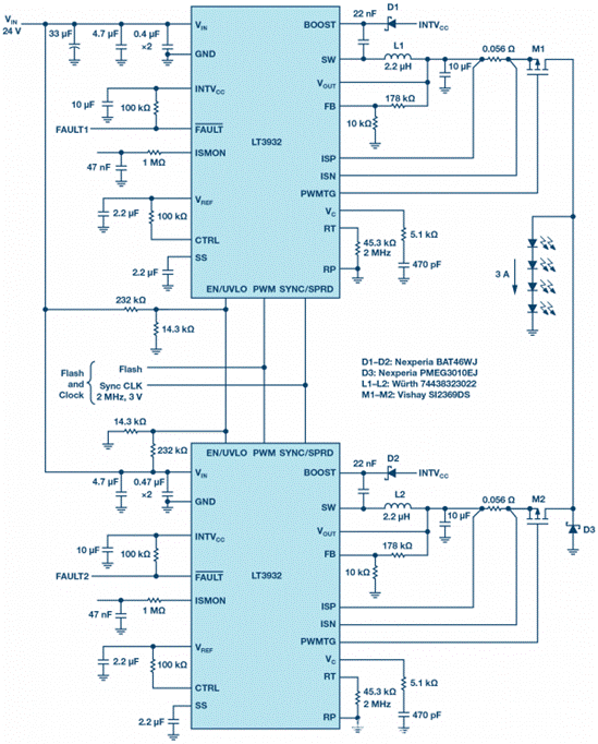 ADI的LT3932專有閃光技術支持擴展,驅動器可以并聯(lián)以提供更高的LED閃光電流。所需的閃光形狀和完整性保持不變。下圖顯示了并聯(lián)兩個驅動器從而支持3 A相機閃光燈,甚至高達4 A的設計也是可行的。