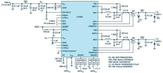 具有I2C控制和報告功能的LT3964雙降壓LED驅動器是一款理想的解決方案,可以通過串行通信技術驅動具有高電流和高帶寬的多個LED或LED串。降壓調節(jié)器具有固有的高帶寬,LT3964在單個封裝中有集成了兩個36 V、2 MHz同步和高頻降壓LED驅動器,還集成了2 A開關,可以相對輕松地驅動多通道大電流LED。