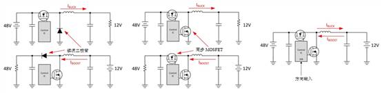 意識到48V電源軌和12V電源軌的電壓范圍從不重疊大大降低了設(shè)計復(fù)雜性。對于從48V電源軌到12V電源軌的電源傳輸,可以使用降壓轉(zhuǎn)換器,而使用升壓轉(zhuǎn)換器可實現(xiàn)12V至48V電源軌方向的電源傳輸。由于千瓦級功率要求,每個轉(zhuǎn)換器應(yīng)使用同步MOSFET代替續(xù)流二極管,以提高系統(tǒng)效率。