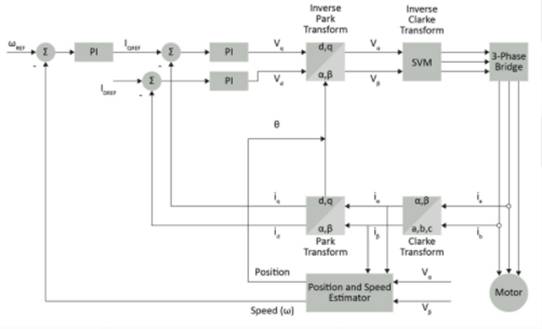同樣具有挑戰(zhàn)性的是電動機控制軟件與電動機機電行為之間的相互作用。圖2顯示了標準的無傳感器FOC框圖。要將其從一個概念應用于實際設計,需要了解控制器架構和數(shù)字信號處理器(DSP)指令,以實現(xiàn)對數(shù)學要求嚴格的時間緊迫的控制回路。