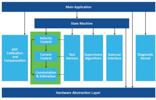 模塊化體系結構的另一個好處是將外圍接口層(或硬件抽象層)與電機控制軟件分離,這使設計人員可以隨著應用程序和性能要求的變化將IP無縫地從一個電機控制器遷移到另一個電機控制器。
