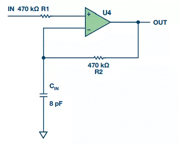 輸入電阻為470 kΩ,所以客戶在反饋路徑中放入一個(gè)470 kΩ電阻。此電阻與8 pF的輸入電容(參見圖4)一起提供一個(gè)42 kHz的極點(diǎn)。AD8628的增益帶寬積為2 MHz,因此它在42 kHz仍有大量增益,并發(fā)生了軌到軌振蕩。把470 kΩ電阻換成0 Ω跳線即解決了問題。因此,反饋路徑中應(yīng)避免使用大電阻。這里,何者為大取決于運(yùn)算放大器的增益帶寬。對(duì)于高頻運(yùn)算放大器,例如增益帶寬積超過400 MHz的ADA4817-1,1 kΩ反饋電阻就稱得上是大電阻。務(wù)必閱讀數(shù)據(jù)手冊(cè)以了解其中的建議。
