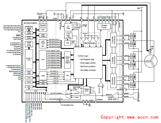 Renesas公司的RAJ306001和RAJ306010是用于三相無刷DC馬達(dá)應(yīng)用的通用馬達(dá)控制集成電路,在同一封裝內(nèi)組合了MCU(RL78/G1F)和預(yù)驅(qū)動器. 預(yù)驅(qū)動器包括半橋柵極驅(qū)動器,5V穩(wěn)壓器,電流檢測放大器,霍爾IC比較器, Back-EMF放大器和各種保護(hù)功能(超溫,過壓/欠壓,過流和馬達(dá)鎖住檢測).三個(gè)半橋柵極驅(qū)動器提供高效率和高度靈活調(diào)整柵極驅(qū)動峰值電流(500mA),自對準(zhǔn)死區(qū)發(fā)生器,可選擇柵極驅(qū)動電壓和控制信號配置功能.MCU支持安全標(biāo)準(zhǔn)IEC60730的硬件,也可提供RL78系列開發(fā)工具. RAJ306001的工作電壓為6V到30V,