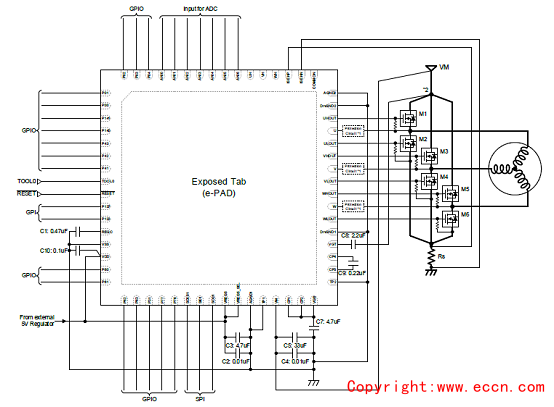 圖3.RAJ306001和RAJ306010推薦外部電路圖:外接5V穩(wěn)壓器,單激勵(lì)功能,無霍爾傳感器類型