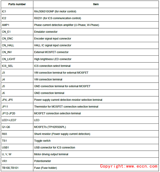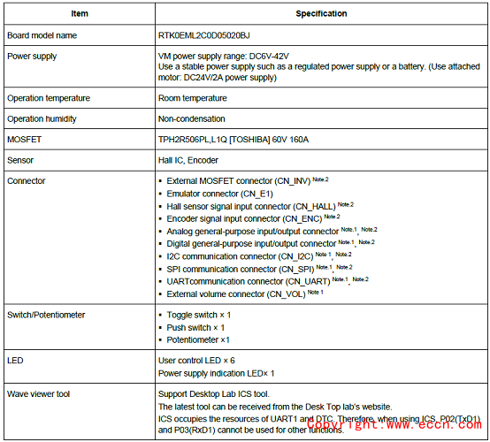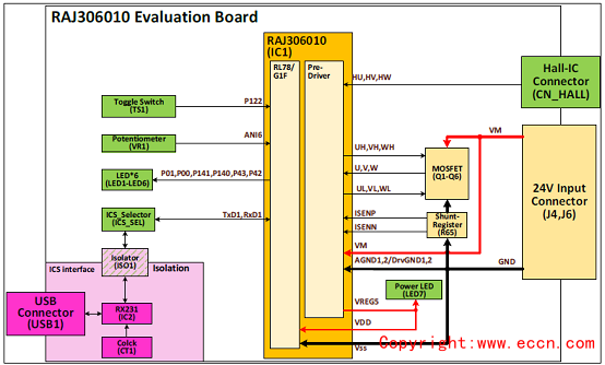 RAJ306010 is initially equipped with a sample code for 120 conduction control using a Hall IC, and a basicevaluation of motor control can be performed simply by connecting a 24V DC power supply and the attachedmotor. In addition, it is possible to connect and evaluate a motor and MOSFET prepared by user.