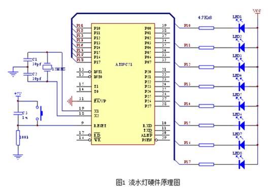 當今時代是一個新技術層出不窮的時代,在電子領域尤其是自動化智能控制領域,傳統(tǒng)的分立元件或數(shù)字邏輯電路構成的控制系統(tǒng),正以前所未見的速度被單片機智能控制系統(tǒng)所取代。單片機具有體積小、功能強、成本低、應用面廣等優(yōu)點,可以說,智能控制與自動控制的核心就是單片機。目前,一個學習與應用單片機的高潮正在工廠、學校及企事業(yè)單位大規(guī)模地興起。學習單片機的最有效方法就是理論與實踐并重,本文筆者用AT89C51單片機自制了一款簡易的流水燈,重點介紹了其軟件編程方法,以期給單片機初學者以啟發(fā),更快地成為單片機領域的優(yōu)秀人才。