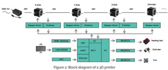 根據(jù)復(fù)雜性和可用功能,一臺3D打印機可以包含4到10個步進電機。圖2顯示了3D打印機的簡化框圖。