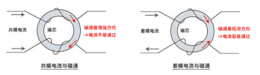 相比之下,共模電流的流向相同,因此磁通量增強,電流不易流過。也就是說,共模電流=共模噪聲難以通過,被濾除。