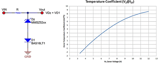圖1顯示了在齊納二極管電路中串聯(lián)一個二極管,曲線繪制了齊納二極管的不同電壓對應(yīng)的溫度系數(shù)。當(dāng)穩(wěn)壓二極管電壓大于4.7V時,溫度系數(shù)逐漸變?yōu)檎龜?shù),因此當(dāng)工作溫度升高時,齊納二極管電壓隨之升高。如果與溫度系數(shù)為負(fù)值的二極管配對,通過降低二極管正向電壓,齊納二極管增加的電壓會被抵銷,從而消除溫度誤差。