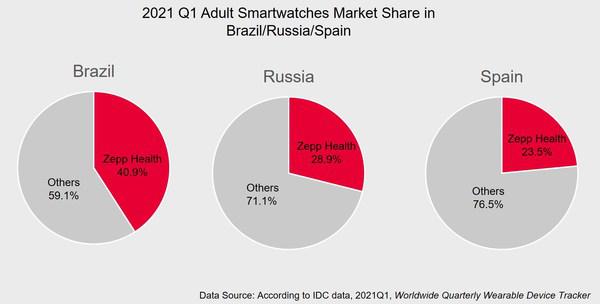 Zepp Health的成人智能手表出貨量在巴西、俄羅斯和西班牙排名第一。
