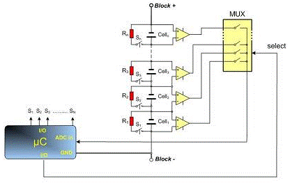 為了對每個電池的荷電狀態(tài)進行管理,每個電池的電壓都要加以測量。由于只有1號電池處于微控制器模數(shù)轉(zhuǎn)換范圍內(nèi),因此不能直接測量電池塊中其他電池的電壓。一種可能的方案是采用差分放大器陣列,但這需要保持整個電池塊的電壓水平。