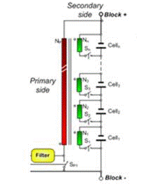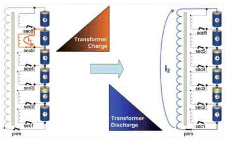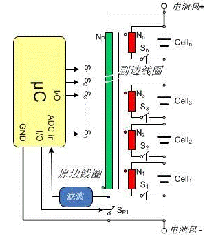 相對被動平衡,不僅提供低頂部均衡,也可以實現(xiàn)底部均衡,當某節(jié)電池電壓過低時,通過接在電池組上的繞組可以把電池組的能量轉(zhuǎn)移到該節(jié)電池上,提高的系統(tǒng)能量的利用率